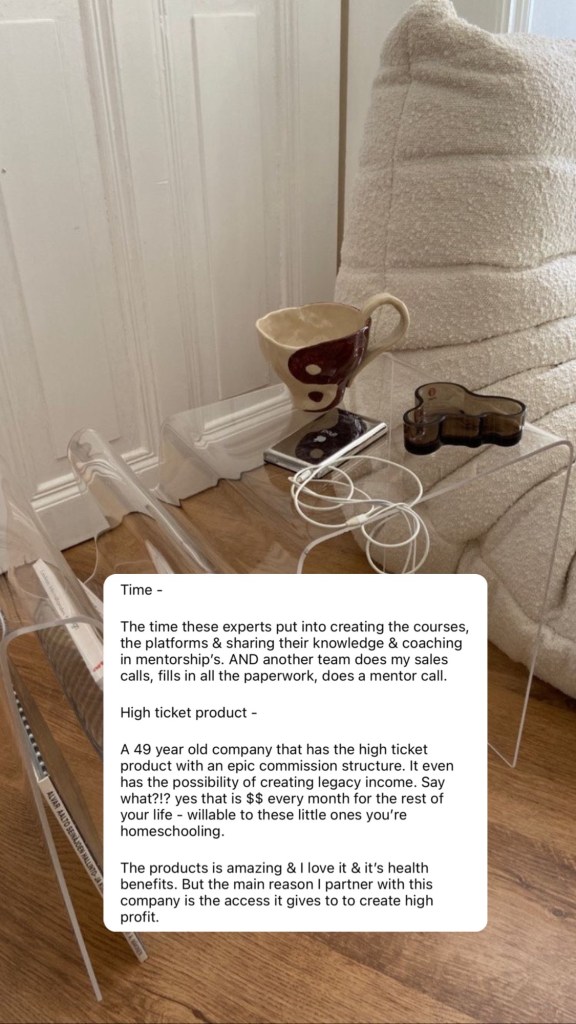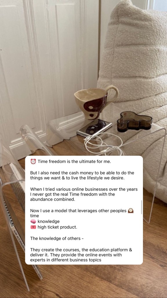The time these experts put into creating the courses, the platforms & sharing their knowledge & coaching in mentorship’s. AND another team does my sales calls, fills in all the paperwork, does a mentor call.